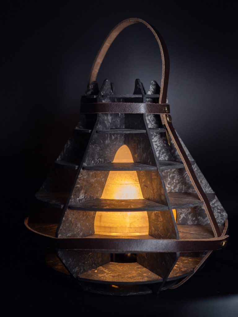 Aube est une baladeuse combinant carbonium, cuir et résine. Inspirée par l’univers des réacteurs d’avions, sa forme évoque les moteurs et turbines, rendant hommage à l’histoire aéronautique du matériau. La structure en gauffre, empruntée aux ailes d’avions et à l’architecture, assure légèreté, solidité et robustesse, tout en étant simple d’assemblage et de découpe grâce à la technologie de découpe au jet d’eau.