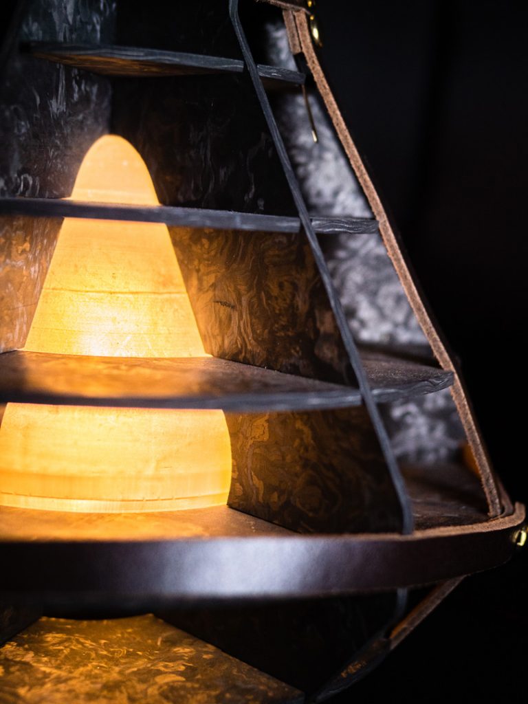 Aube is a balladeuse combining carbonium, leather and resin. Inspired by the world of jet engines, its shape evokes engines and turbines, paying homage to the material’s aeronautical history. The waffle structure, borrowed from aircraft wings and architecture, ensures lightness, solidity and sturdiness, while being easy to assemble and cut thanks to water-jet cutting technology.
