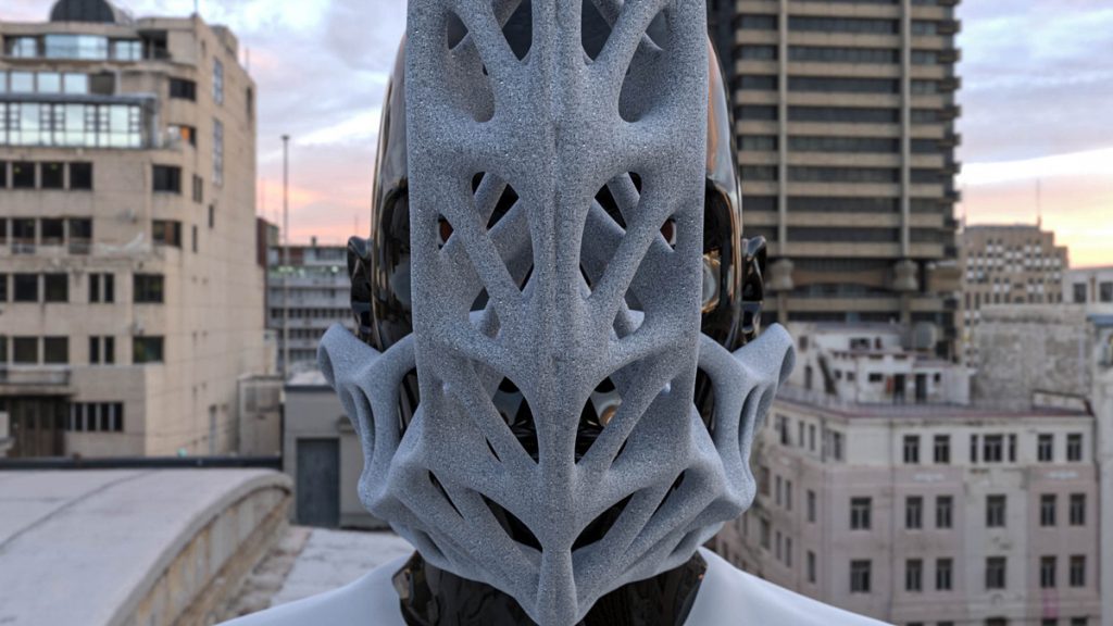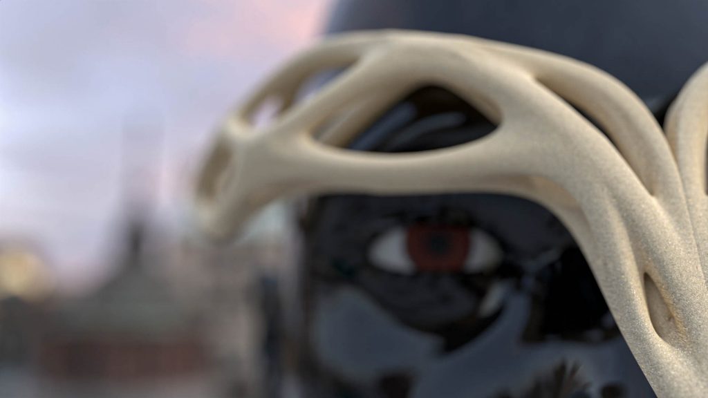 Entre optimisation topologique et Design organique, ce projet simule des excroissances produites par le corps lui-même (d’après le modèle de la structure osseuse). Elles viennent accentuer certains os du visage et ont toutes une fonction particulière qui leurs sont associées: l’intimidation et la défense. Comme si le corps avait évolué afin de se protéger des diverses aggressions qu’il peut rencontrer à l’extérieur, ce projet par le biais de l’objet fictionnel tend à questionner la position actuelle, et future, du «soi» parmi les autres.