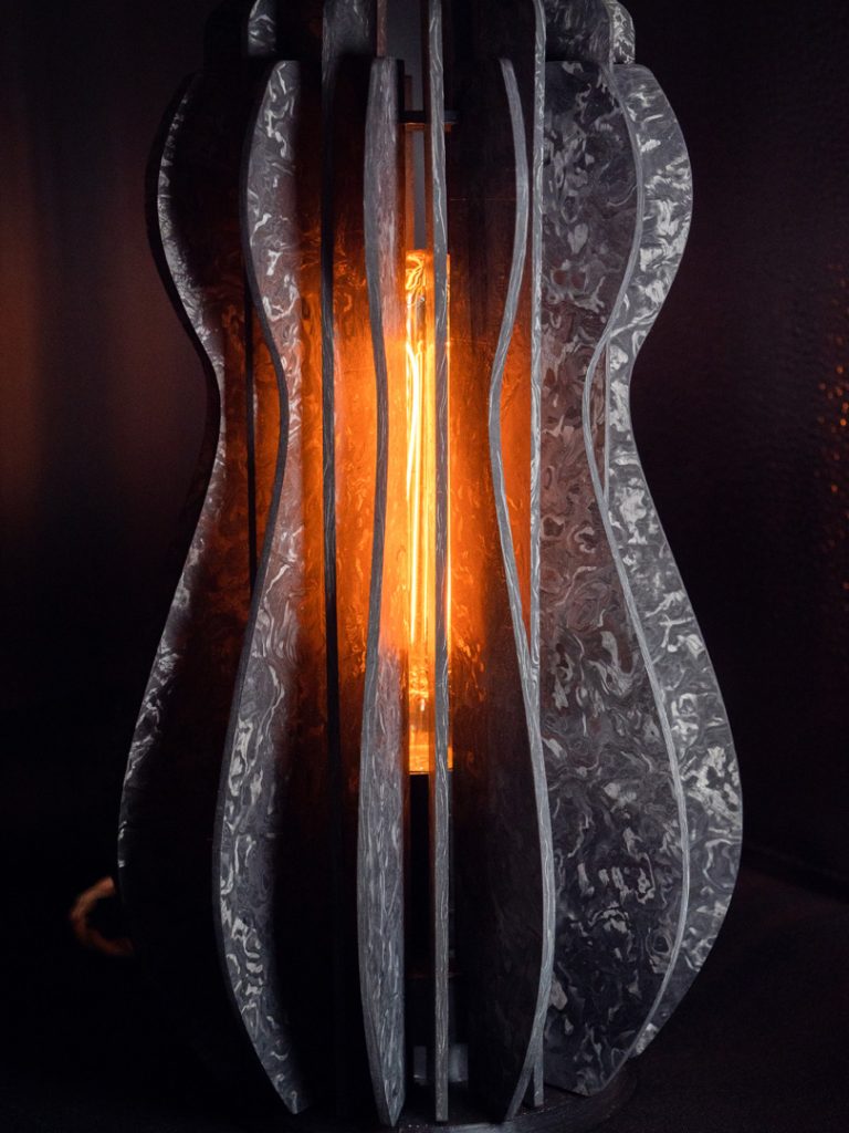 This lamp project is inspired by the arched shape of a gourd, called Hulu in Chinese. Composed of 26 parts and two rings, the lamp uses natural, elongated curves. With dimensions of 300 mm in height and 170 mm in width, it is ideal as a table lamp. A 14-degree gap ensures optimum light divergence, preventing glare. Its organic shape exudes a lively aesthetic.