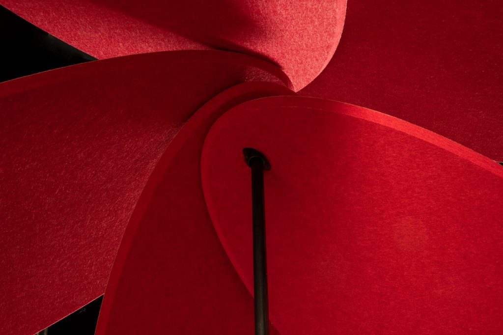 Le lustre Pétale, composé de cinq panneaux acoustiques, confère un air floral à l’espace dans lequel il se déploie.