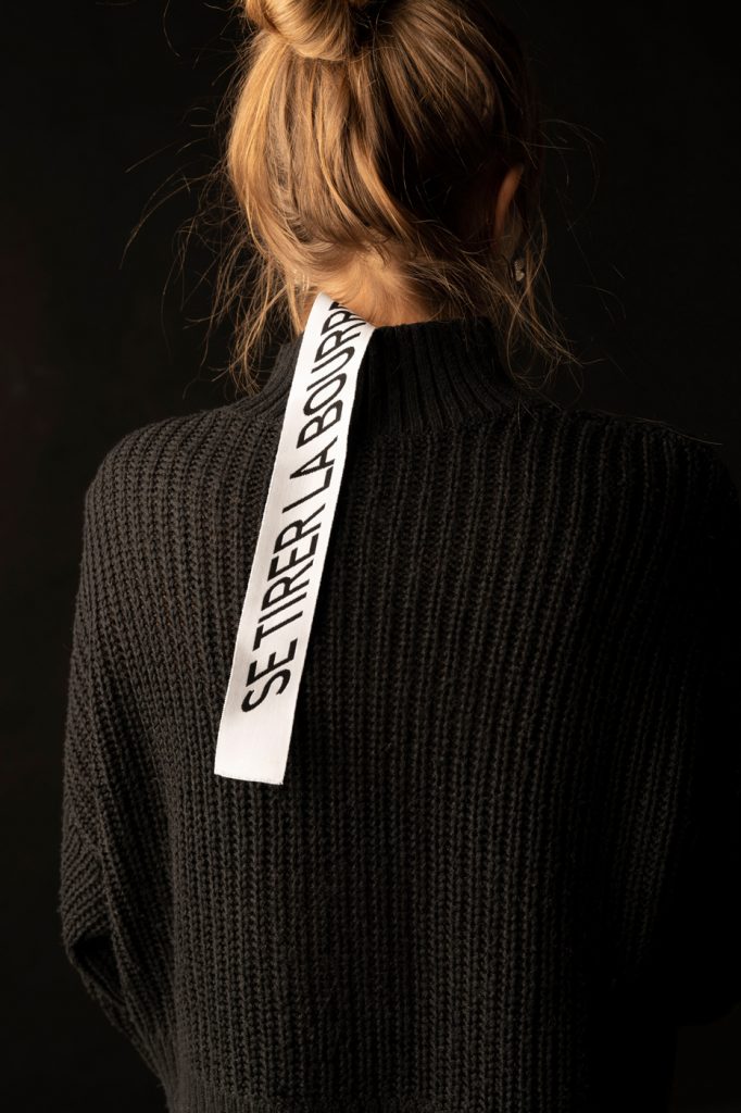 Collaboration with Julien Faure’s ribbon company. The idea is to add value to French tradition, know-how, and quality through the use of old expressions written on labels. Thought as a fashion item itself because of its size and meaning, the label here takes on more significance in relation to the object it adorns. Every expression has origins and meanings that are related to French history. It is also possible to use a label like this one on any other object.