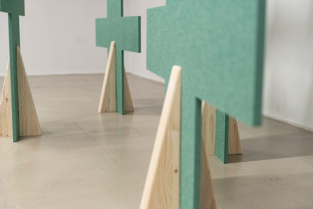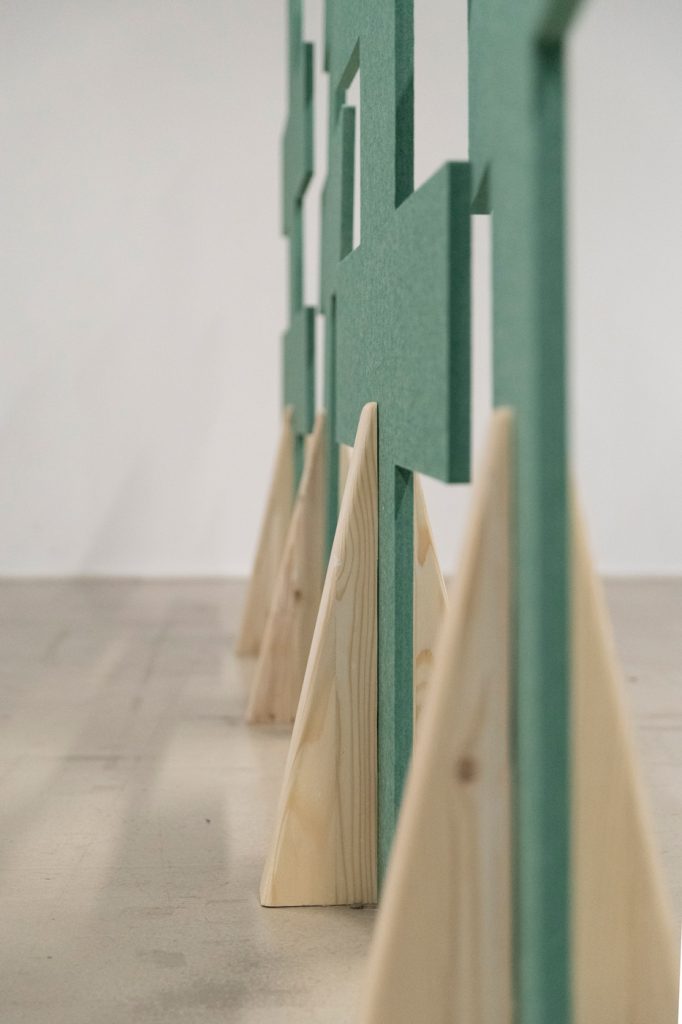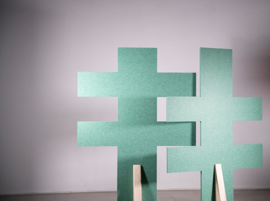 Scrum wall is a space divider with heightened acoustic properties, composed of interlocking elements. Arm in arm, the panels form a wall reminiscent of a scrum.