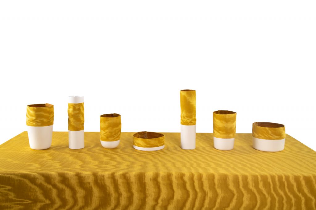 Cette table est composée d’objets hybrides entre passé et présent, mettant en valeur l’héritage de la moire dans un nouveau domaine. L’empreinte du textile moiré, capturée dans la céramique, donne à voir les vibrations visuelles d’un motif plus ou moins visible selon l’angle adopté pour l’examiner.
