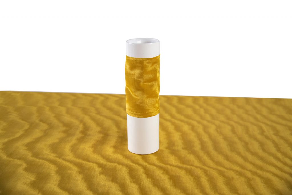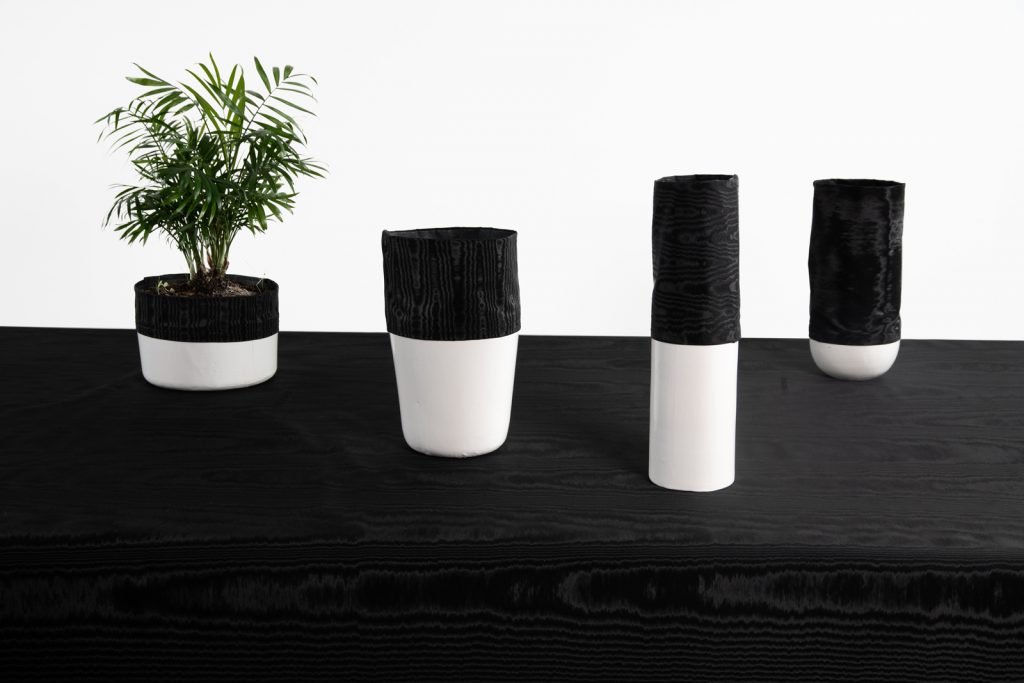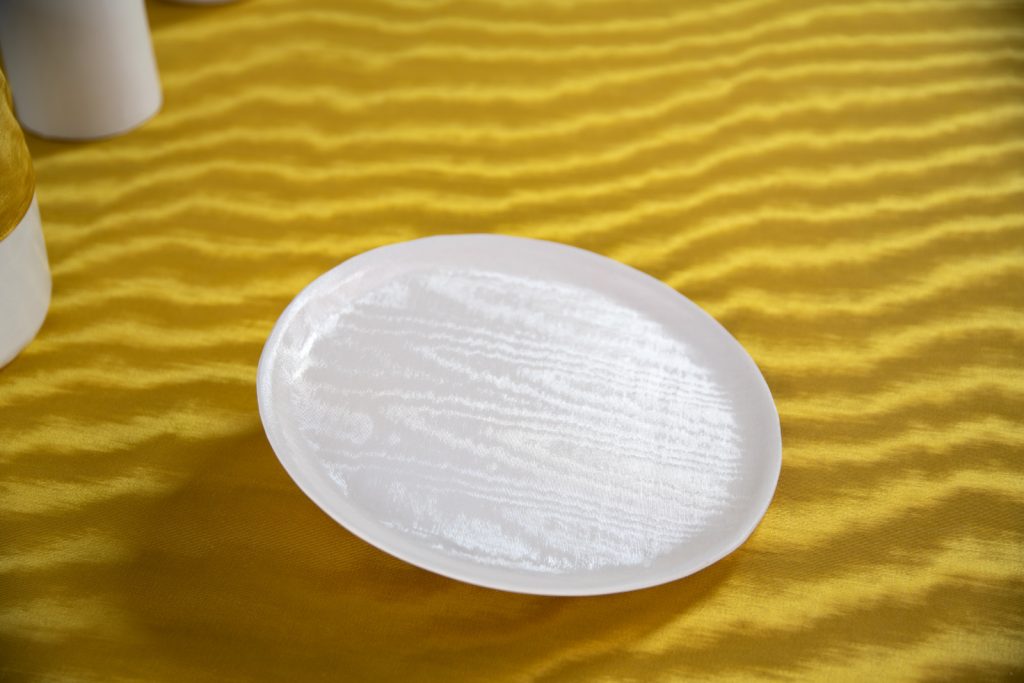 On this table sit hybrid objects between past and present, which highlight the legacy of moire in a new field. The imprint of the moire textile, captured in ceramic, allows us to see the visual vibrations of a pattern, more or less visible, depending on the angle chosen to examine them.